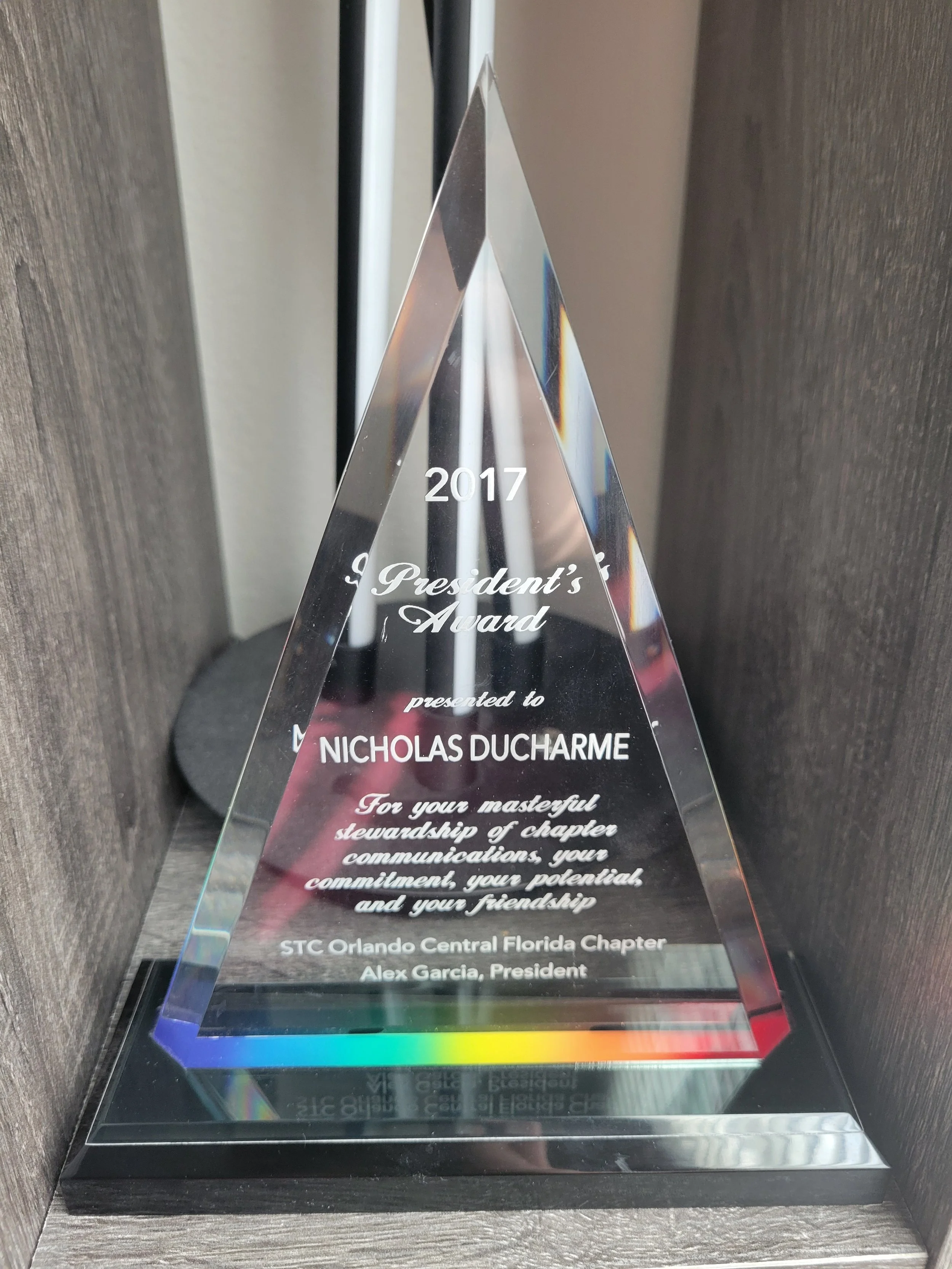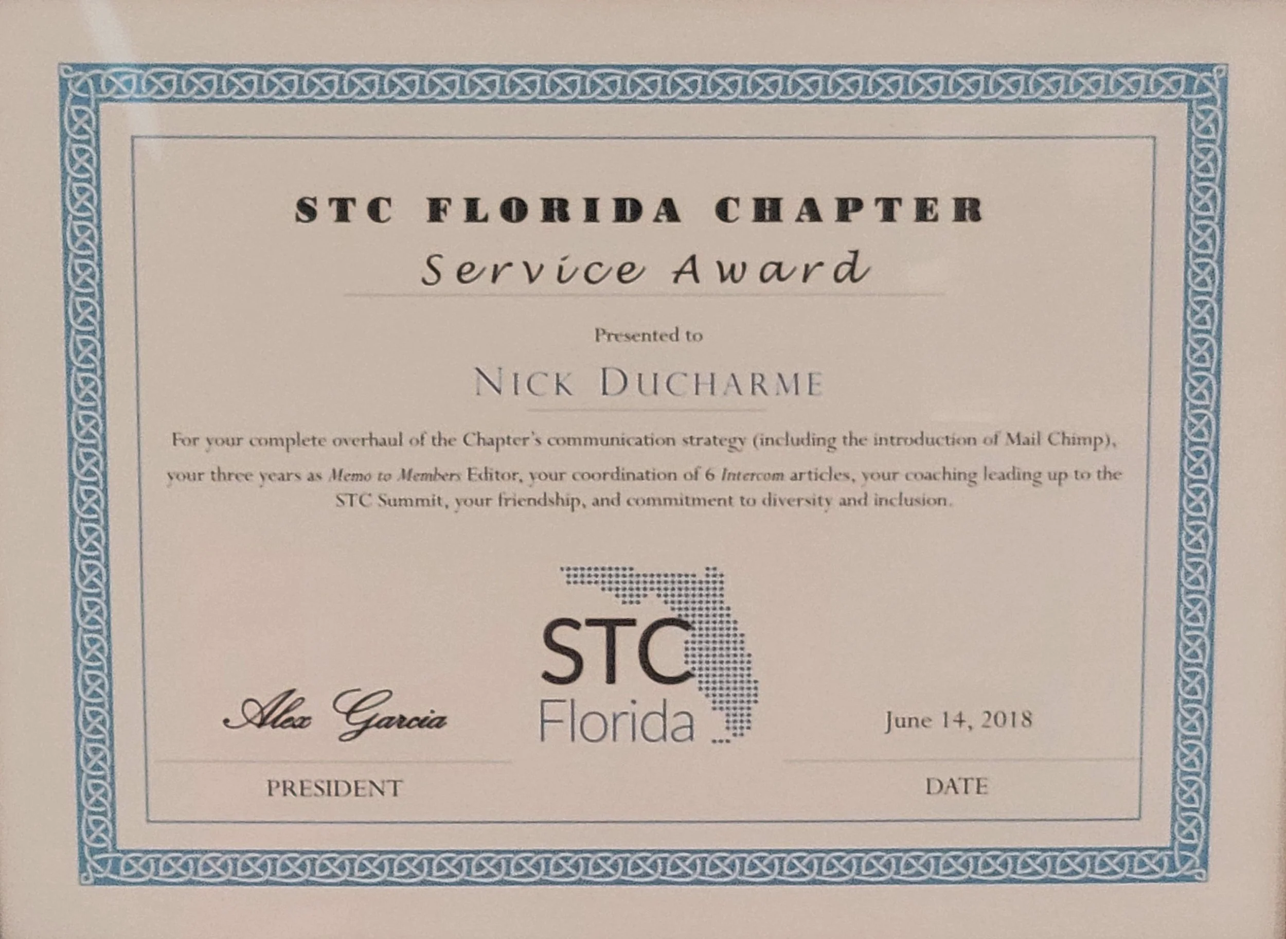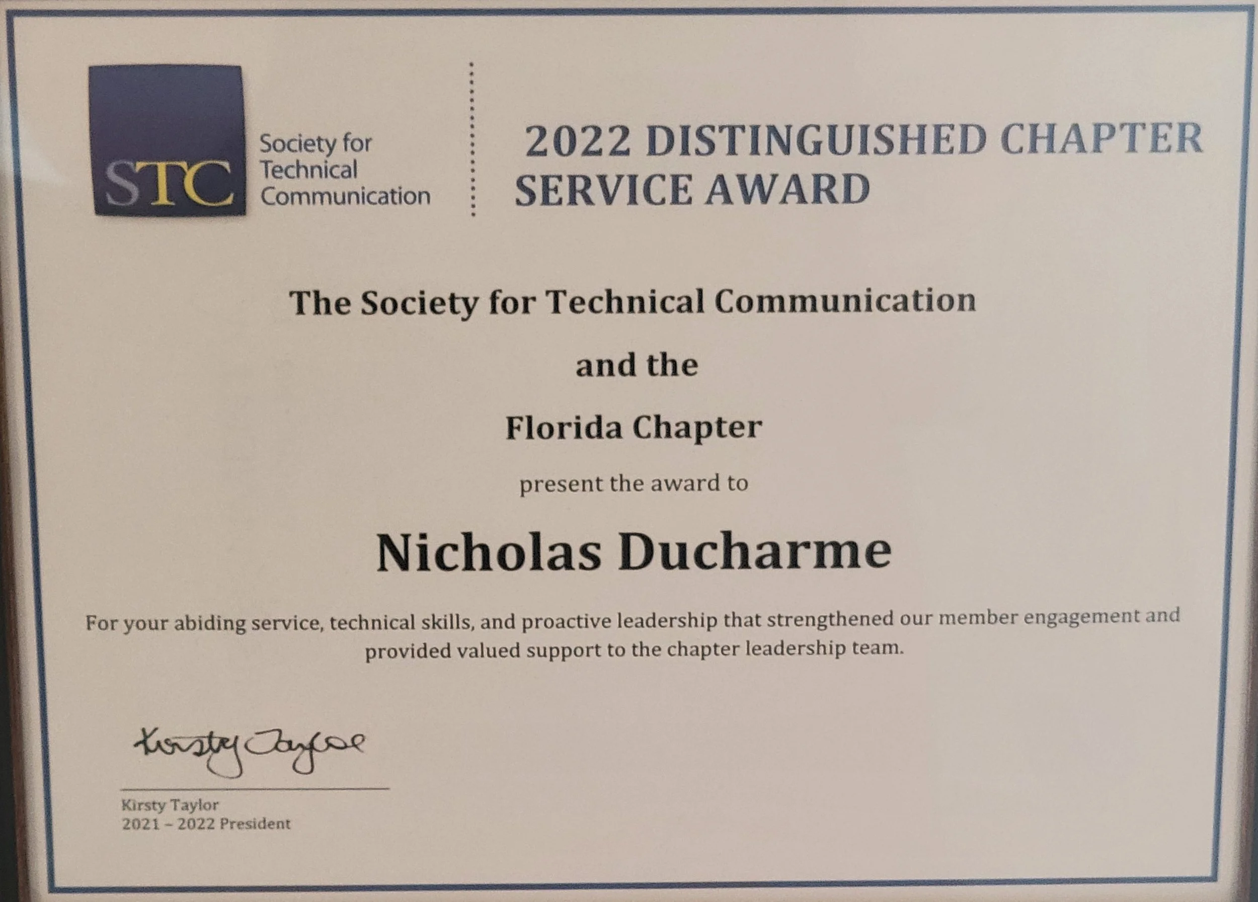 Other roles served included Acting President (2019), Vice-President (2018–2019), and Director-At-Large (2019–2020). I am most proud of my time as Vice-President because I helped to modernize the chapter so that it could become a true statewide chapter for Florida. This meant expanding online and hybrid offerings, as well as tailoring meeting content to member preferences based on a survey that I created. I also added more skills-based training to the meeting lineup. Furthermore, the modernized approach that I helped to introduce enabled the chapter to survive the challenges of COVID-19 the following year, since the infrastructure for online-only meetings was already in place.