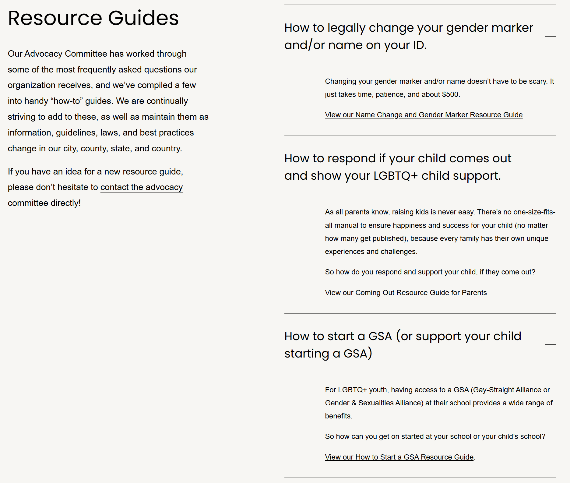 One of these goals is to create and publish a suite of resource guides that benefit the LGBTQ+ community and their allies in the local area. Our documentation team reports up to me each month in our committee meetings. To date, the following three guides have already been published. (Click or tap the following links to review these project samples.)